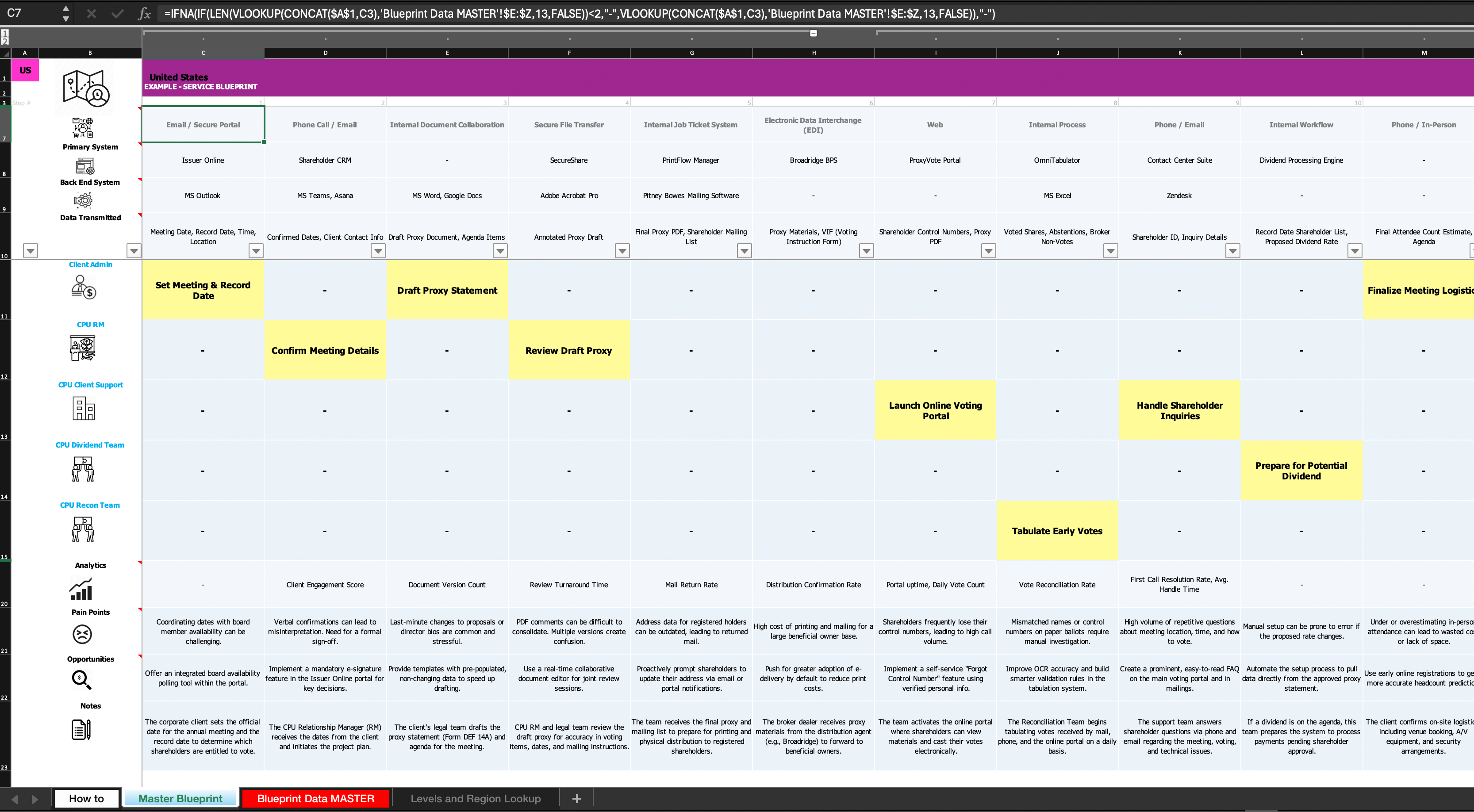 I designed and built a custom, scalable service blueprint application in Excel, featuring separate tabs for standardized data entry and automated, real-time visualization.